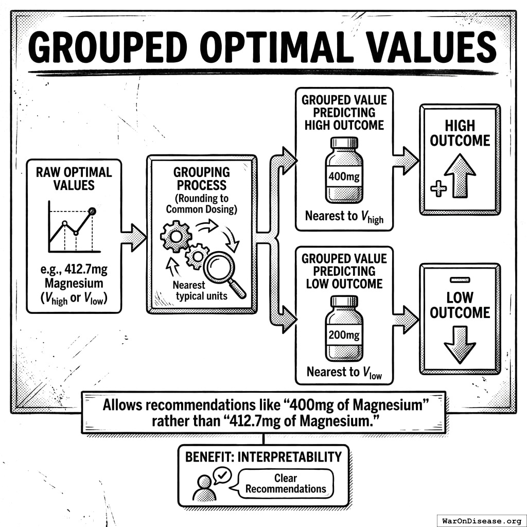 - Grouped Optimal Value: The nearest commonly-used dosing value to the calculated optimal value, enabling practical recommendations (e.g., “400mg” instead of “412.7mg”)