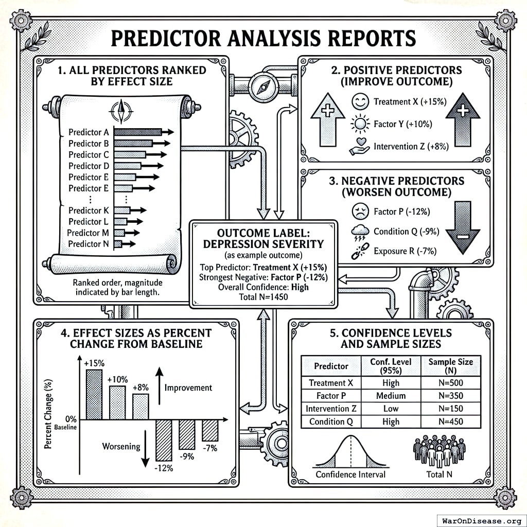 - Treatment Ranking: Ordered list of treatments by efficacy or safety for a given outcome, sorted by effect size with confidence weighting. Rankings include percent change from baseline, confidence intervals, sample sizes, and Predictor Impact Scores. See Section 8 for ranking methodology.
