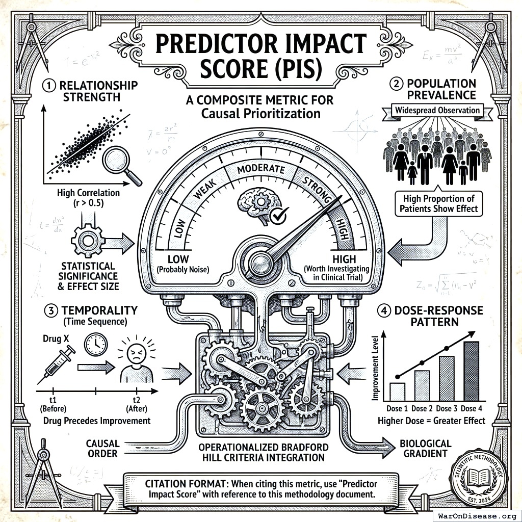 - Predictor Impact Score (PIS): Composite metric quantifying how much a predictor impacts an outcome. Integrates correlation strength, statistical significance, z-score (effect magnitude), temporality factor, and interest factor at the user level; adds consistency, plausibility, and biological gradient at the aggregate level. Higher scores indicate predictors with greater, more reliable impact. Ranges from 0 to ~1.