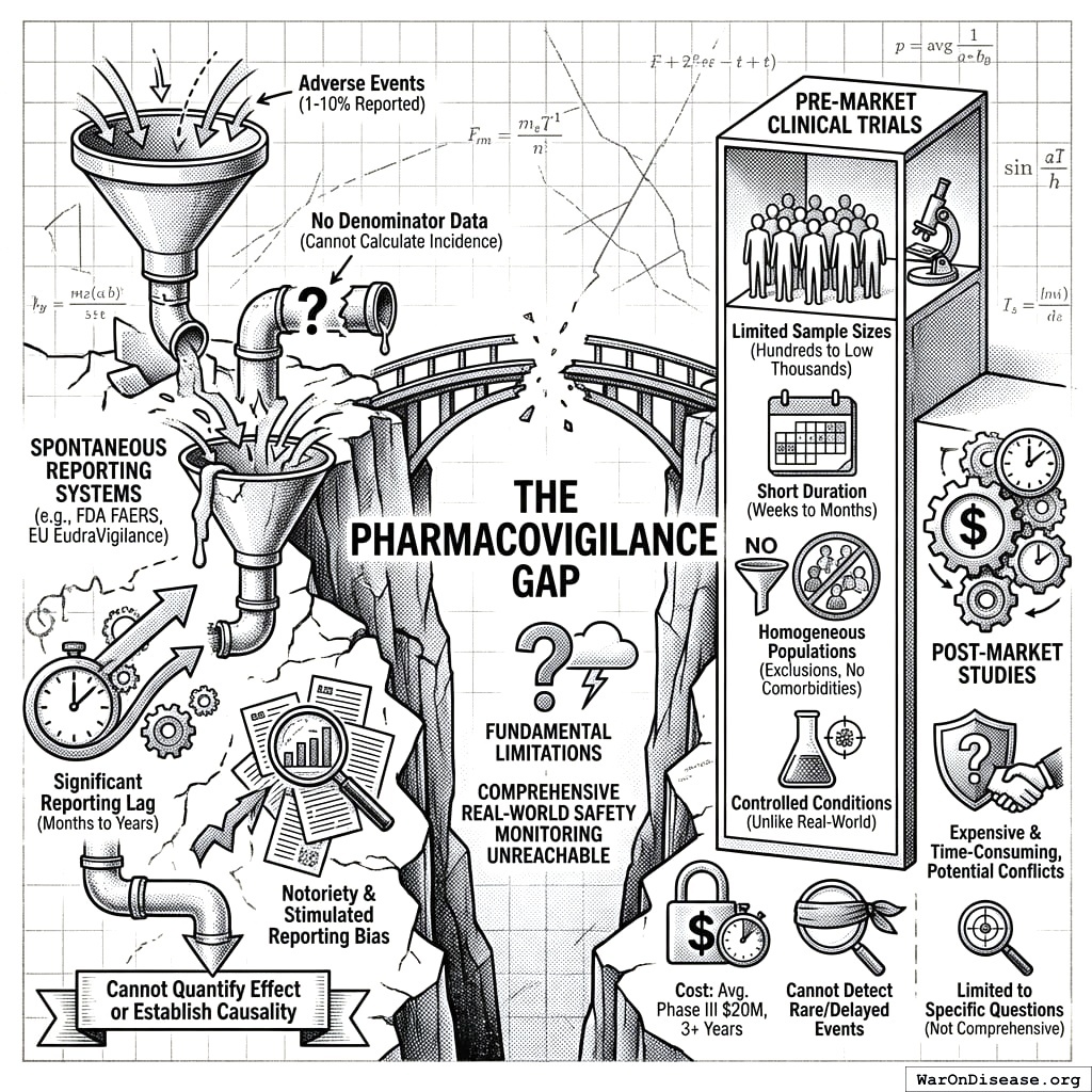 Modern pharmacovigilance (the science of detecting, assessing, and preventing adverse effects of pharmaceutical products) faces fundamental limitations: