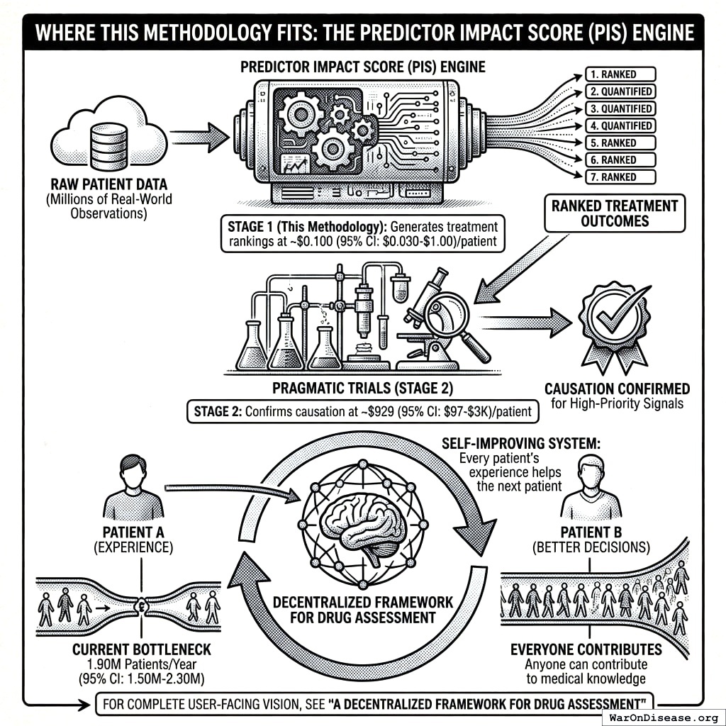 Stage 1 (Signal Detection): Aggregated N-of-1 observational analysis138,139 integrates data from millions of individual longitudinal natural experiments. The methodology applies temporal precedence analysis with automated hyperparameter optimization, addresses six of nine Bradford Hill causality criteria through a composite Predictor Impact Score (PIS), and produces ranked treatment-outcome hypotheses at ~$0.1.