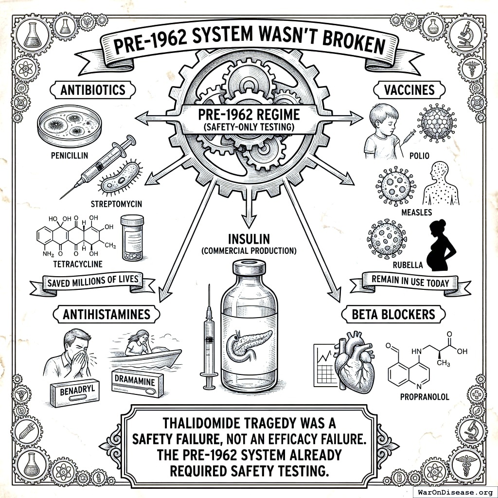 Post-1962 regulations added years of preclinical work before you can touch a human: