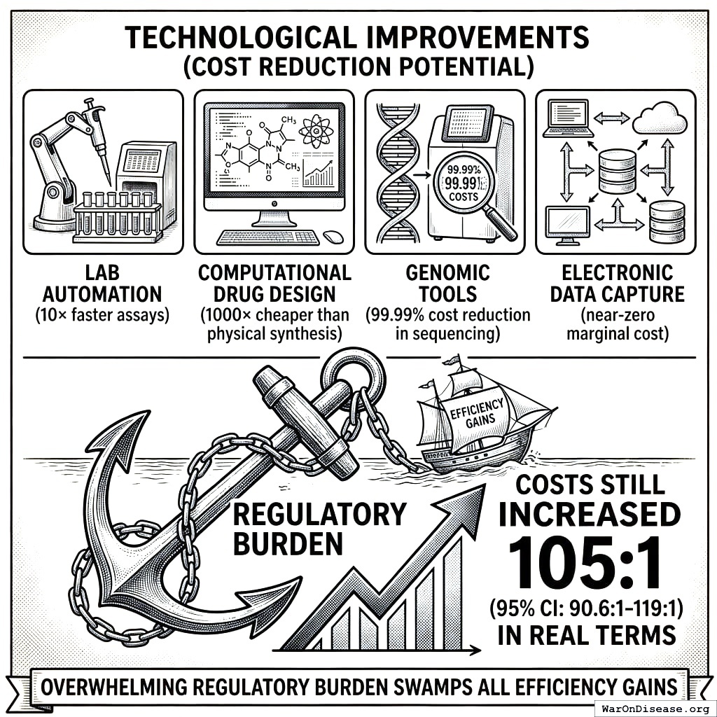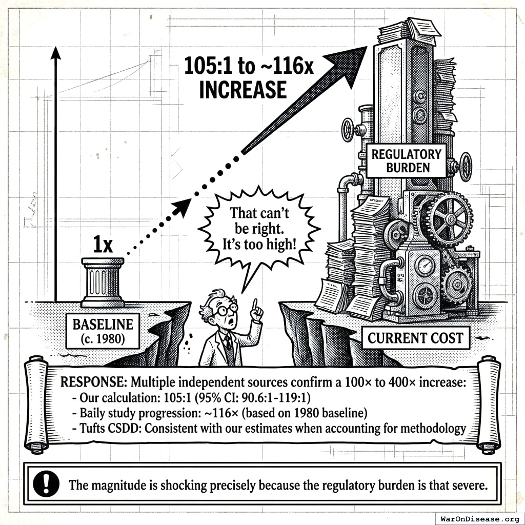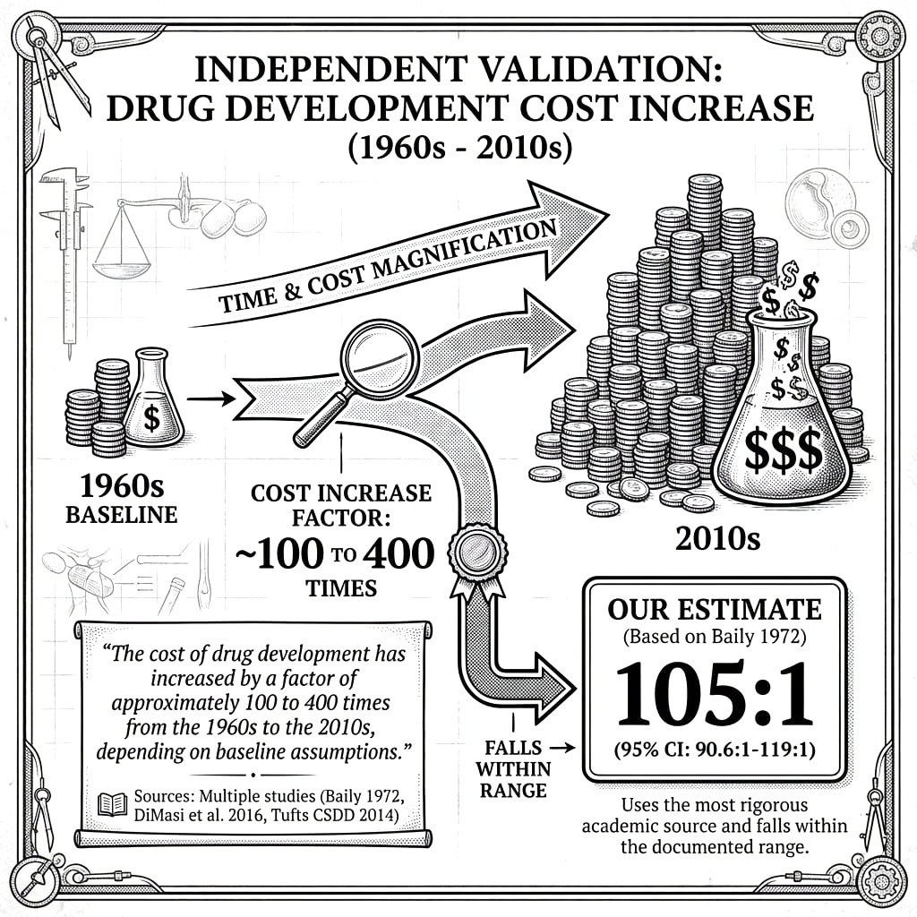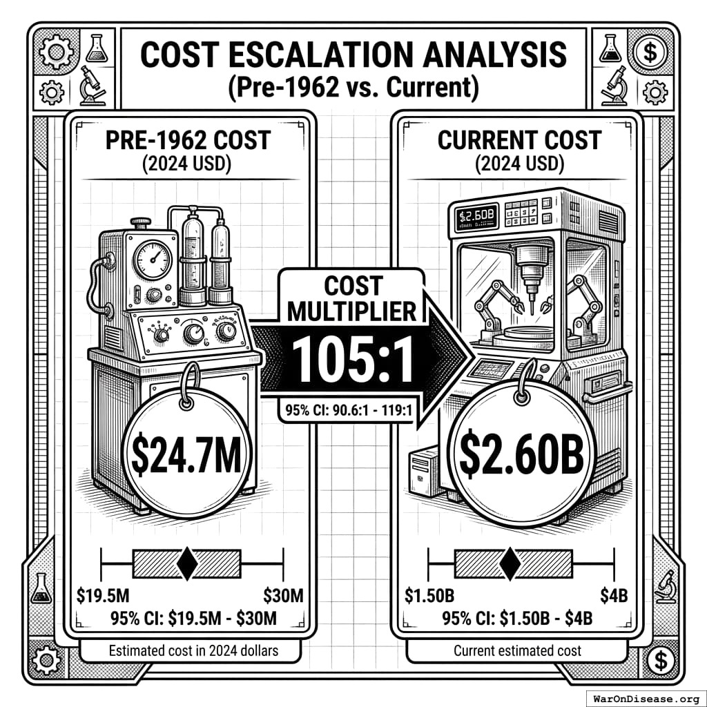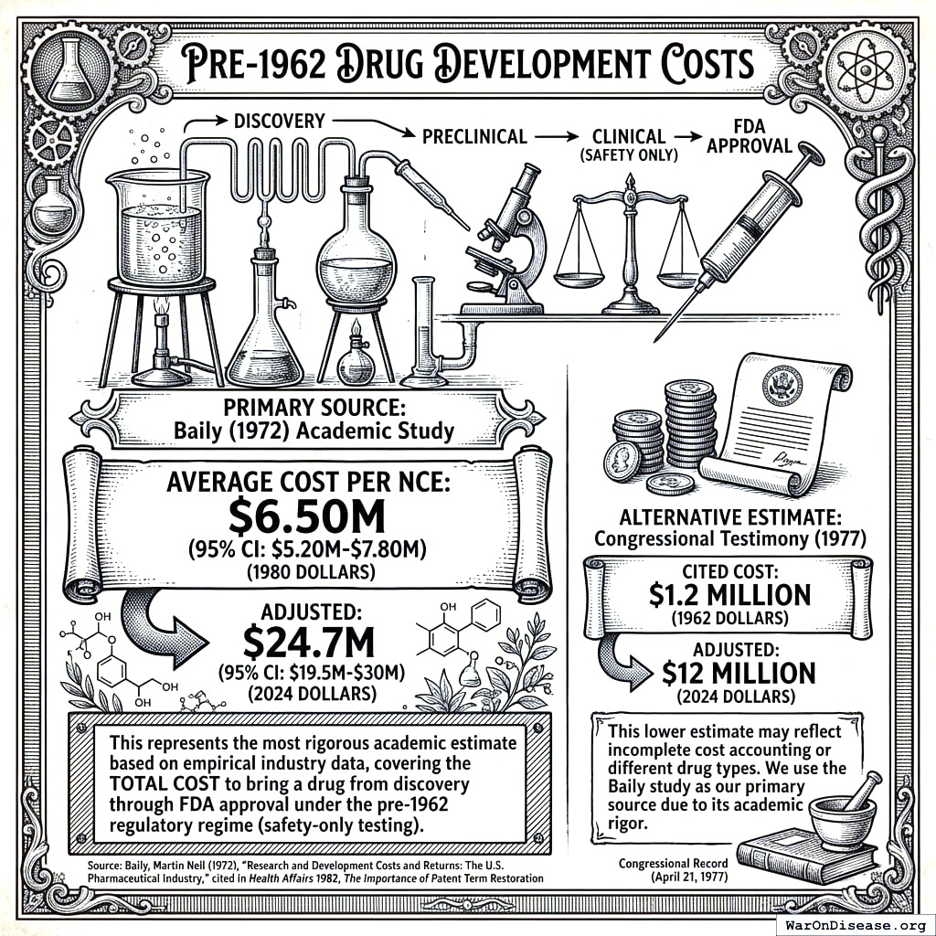 1962: Average cost $1.2 million (in 1962 dollars) 1972: $11.5 million 1977: Projected $40 million Inflation-adjusted to 2024 dollars: $1.2M (1962) ≈ $12M (2024), using CPI multiplier of 10× Real cost increase (inflation-adjusted): $12M (1962) → $2,600M (2024) = 217× increase Note: Lower estimate than Baily (1972); may reflect incomplete cost accounting or different drug types. Baily’s $6.5M (1980 dollars) = $22.5M (2024 dollars) is the more rigorous academic estimate Additional sources: https://www.congress.gov/95/crecb/1977/04/21/GPO-CRECB-1977-pt10-2-3.pdf