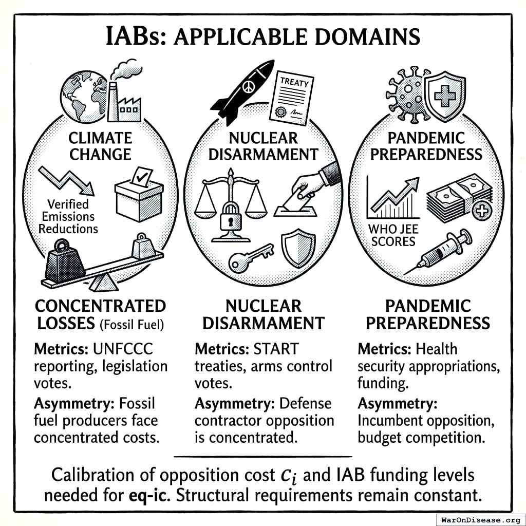 These estimates are illustrative and require empirical calibration. The general pattern suggests that domains with lower concentrated opposition (pandemic preparedness, health research) require lower IAB funding to achieve incentive compatibility, while domains with entrenched industrial opposition (climate, defense) require larger investments.