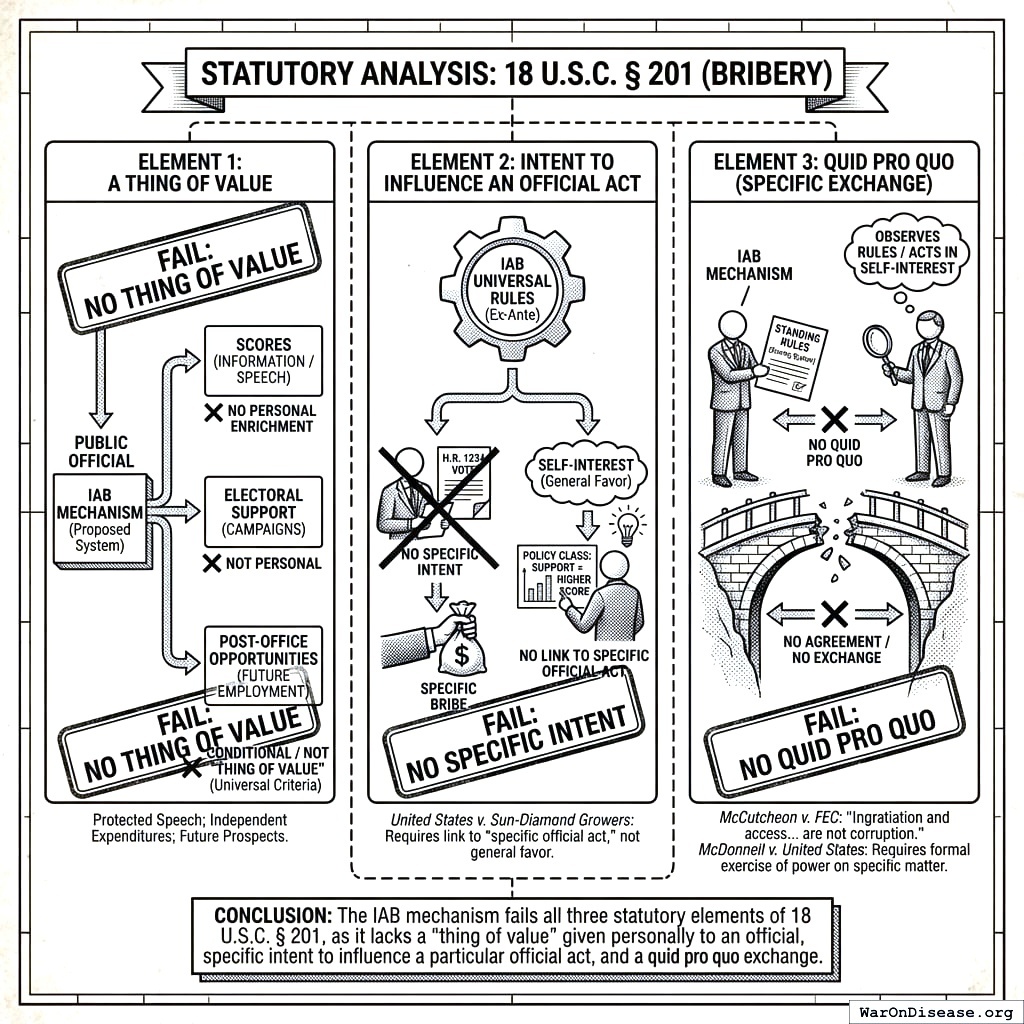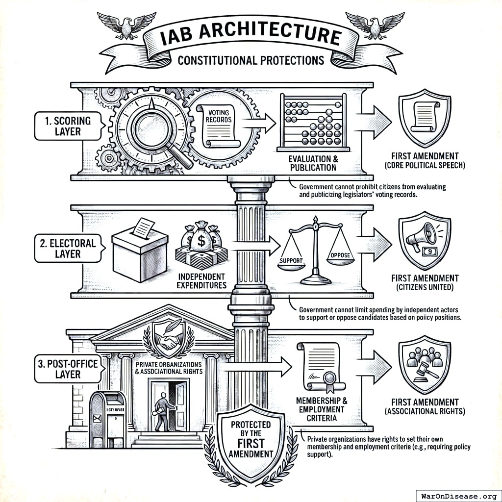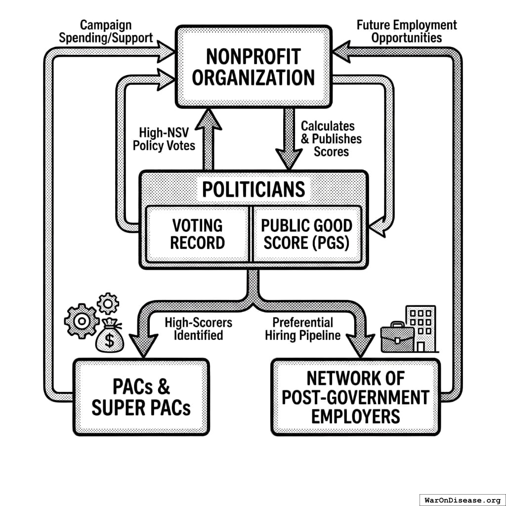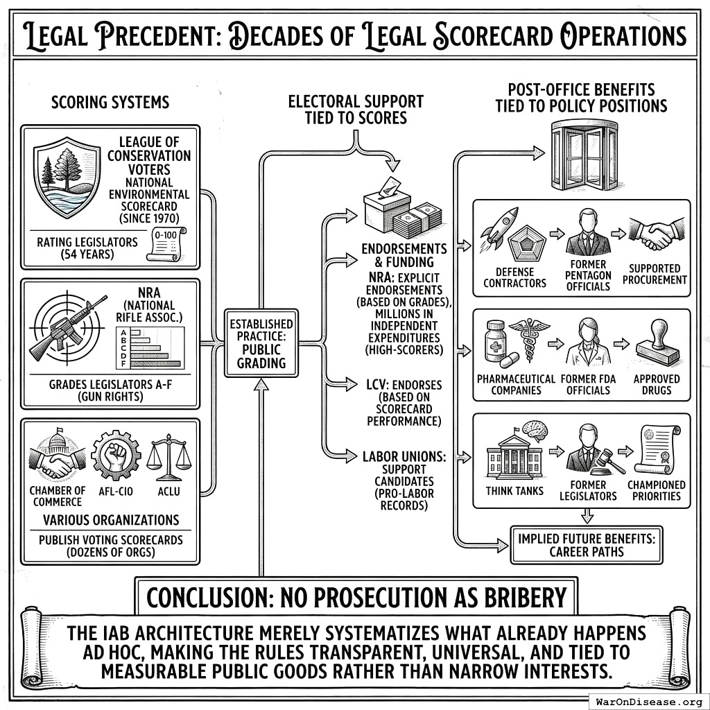 A natural objection: “How is this not just PACs + voter scorecards + SIBs?” The answer is that existing mechanisms fail to solve the Olsonian problem because they operate in isolation. PACs exist but remain dominated by concentrated interests due to the 90:1 capital asymmetry. Scorecards exist (League of Conservation Voters, NRA ratings) but lack teeth without accompanying financial incentives. SIBs exist but require government to agree upfront, which faces the same collective action problem IABs solve. IABs integrate all three components (investor capital, electoral accountability, post-office incentives) into a single instrument where each component’s effectiveness depends on the others, and where the funding mechanism creates permanent financial incentives for diffuse beneficiaries to overcome collective action barriers. The whole is greater than the sum of its parts because the integrated architecture makes coordinated capital deployment economically rational for millions of individual investors.