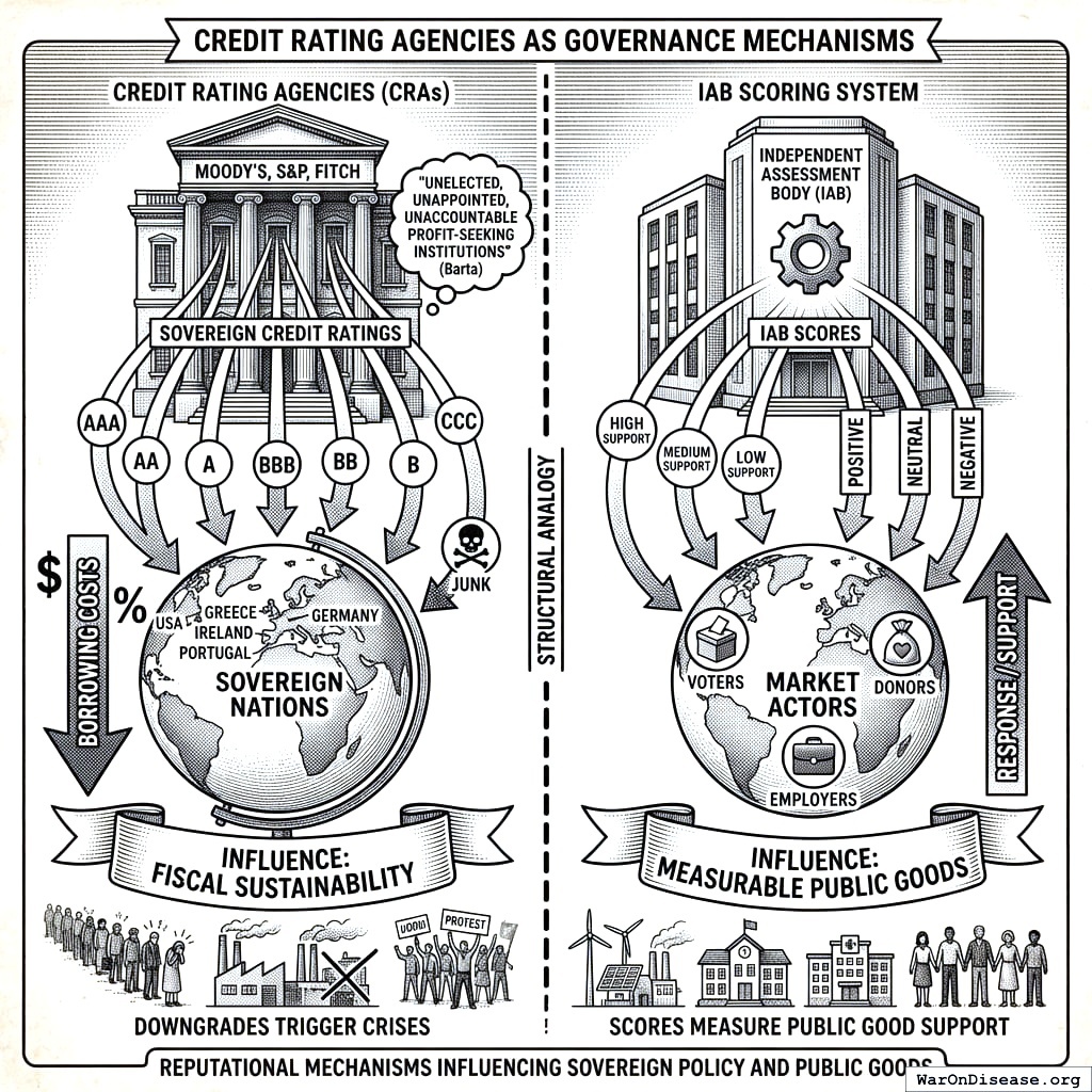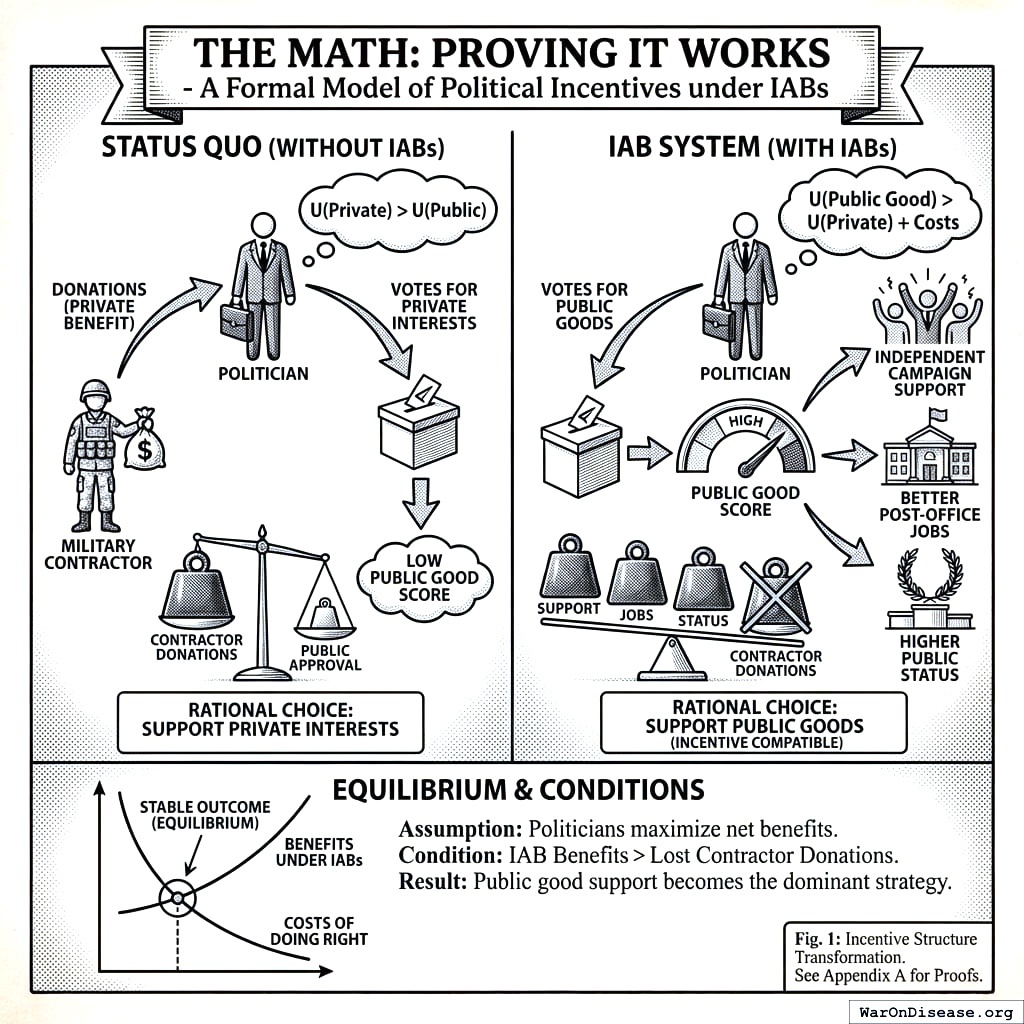 Calibration notes. Pharmaceutical industry lobbying exceeds $300M annually. However, pandemic preparedness funding faces less concentrated opposition than military or fossil fuels, suggesting lower IAB funding thresholds may achieve incentive compatibility.