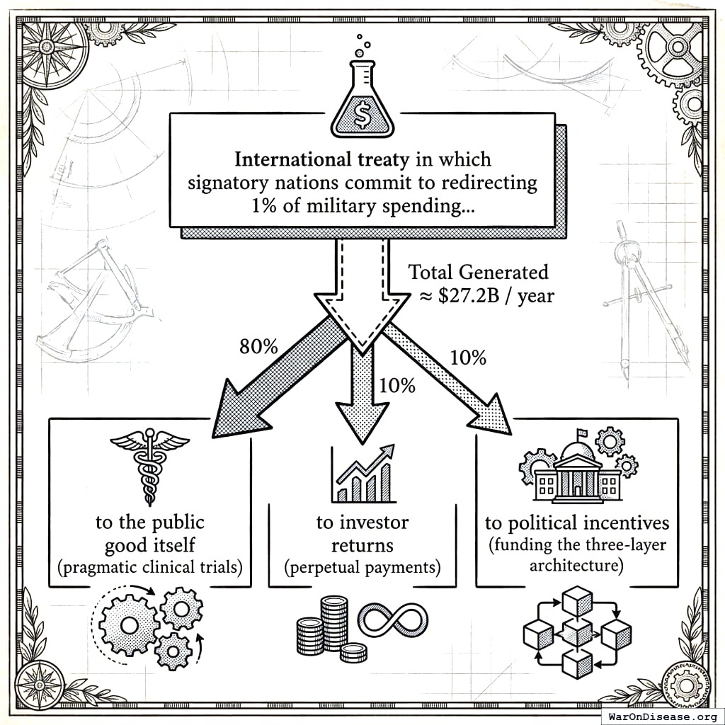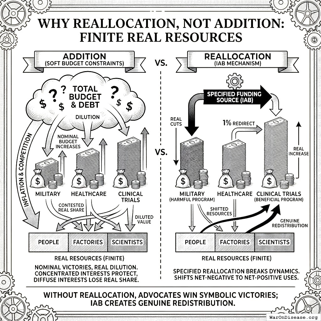 IABs break this dynamic by specifying the funding source as part of the mechanism. The policy does not say “fund pragmatic clinical trials”; it says “redirect 1% of military spending to pragmatic clinical trials.” This forces a real reallocation: