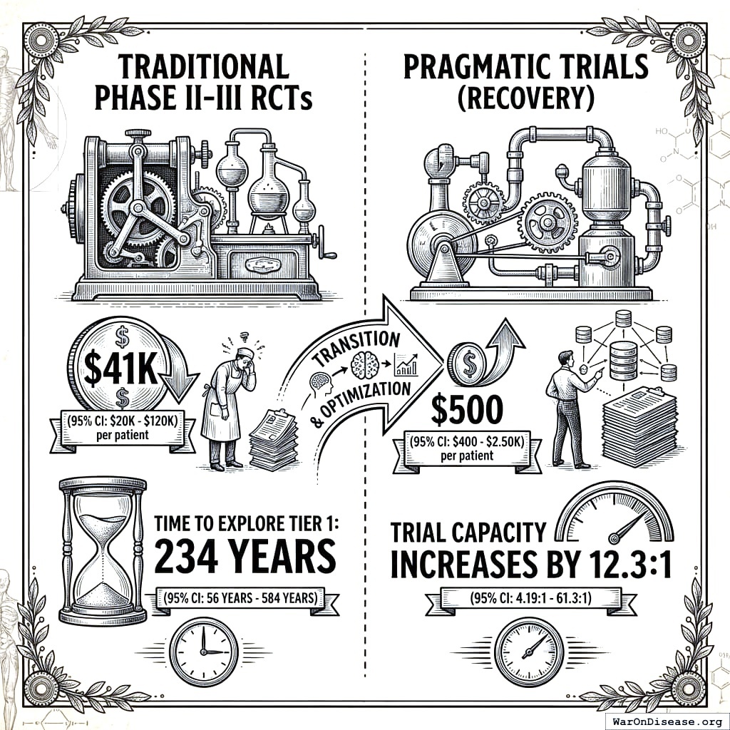 Still not fast. But at least it’s a number your grandchildren might live to see the end of, rather than a number that requires your species to outlive its own star. The first few decades would capture the highest-value discoveries, the cures that current trial scarcity forces you to ignore while people die in the waiting room.