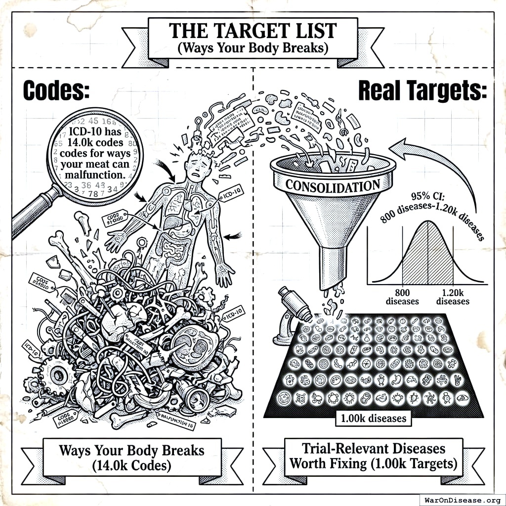 Fourteen thousand ways to be sick, but only 1,000 worth testing drugs against. The other 13,000 are just spelling variations.