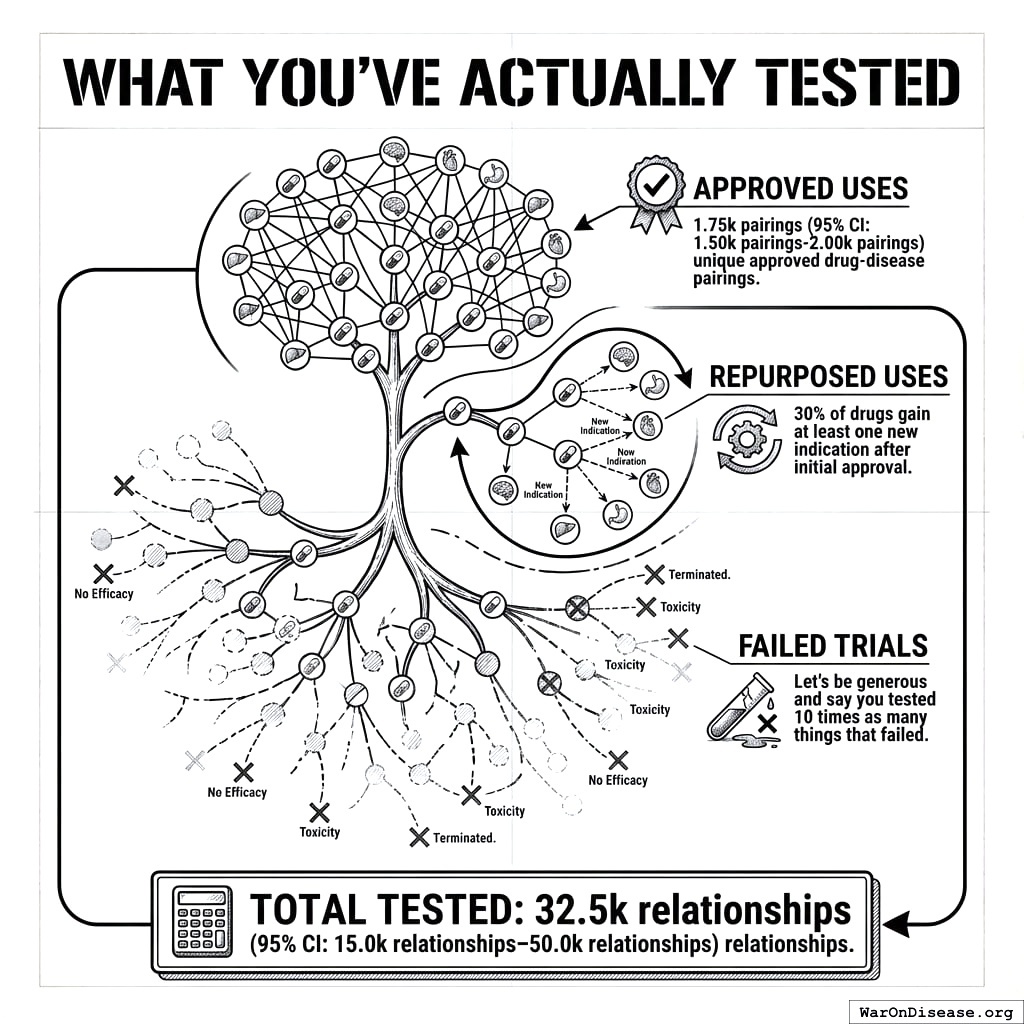 • Approved uses: 1.75 thousand pairings unique approved drug-disease pairings. This is your entire medical canon. Five thousand years of civilization. Libraries of medical journals. Nobel Prizes. White coats. Stethoscopes. All of it produced this number.