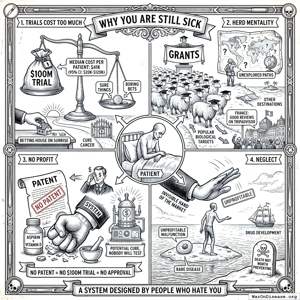 The ticket price is insane. A typical Phase II-III trial costs $30-$100M (median cost per patient $41K). At that price, you only test things pharmaceutical companies can patent and sell at enormous markups. Everything else sits untested. Imagine a dating app where each date costs $100 million and only billionaires are allowed to swipe. That’s your drug approval system. The molecules without money die alone.