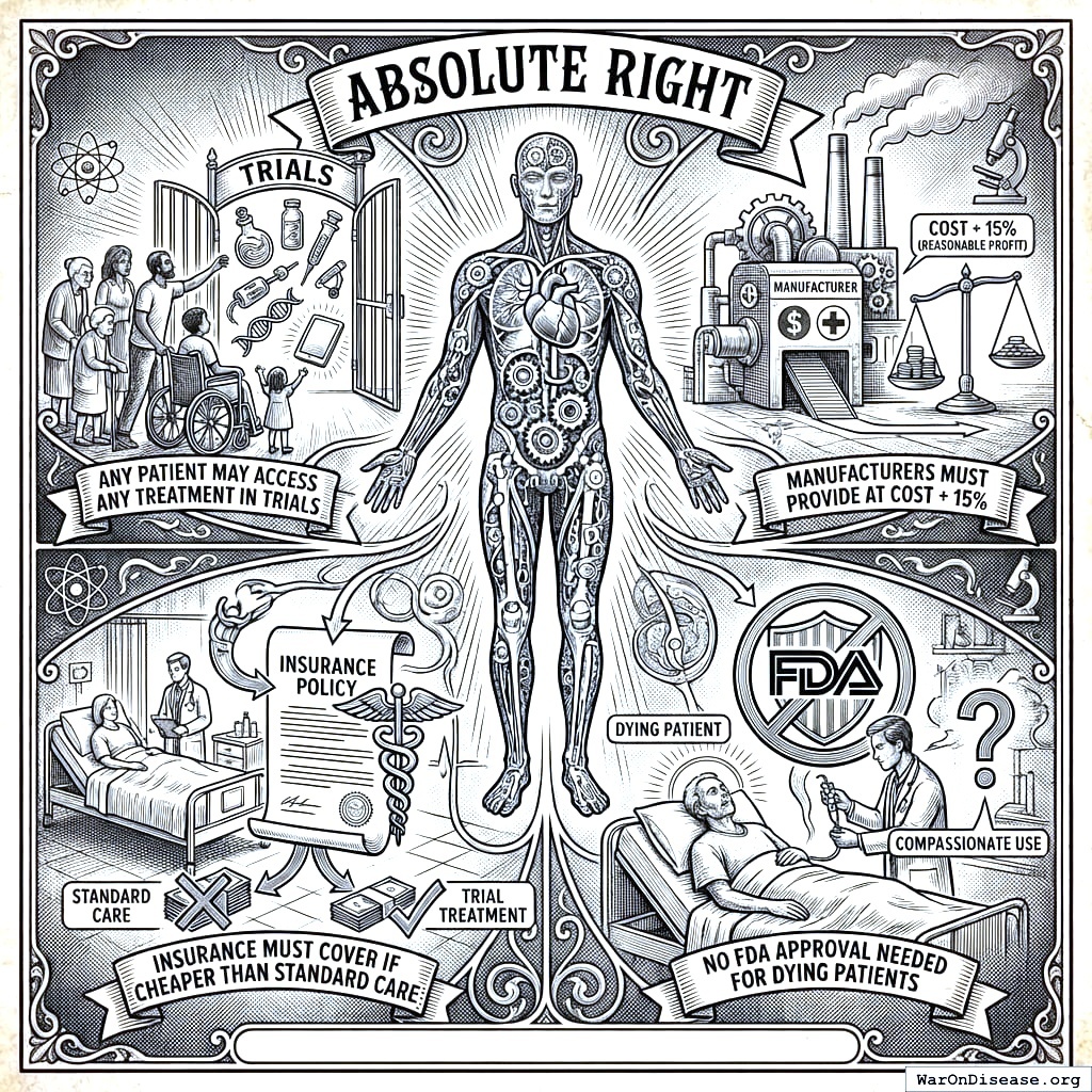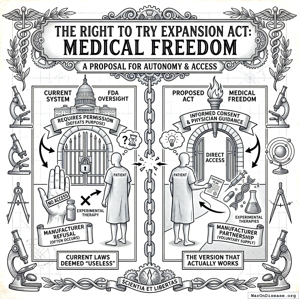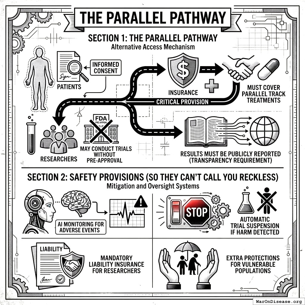 This act creates your decentralized FDA141,142. It builds a legal pathway for treatments to operate outside the FDA’s 17-year death march. Patients get choices. Researchers get freedom. People stop dying while waiting for approval.