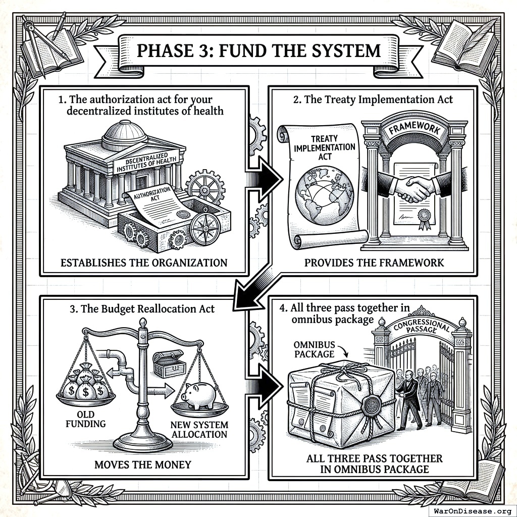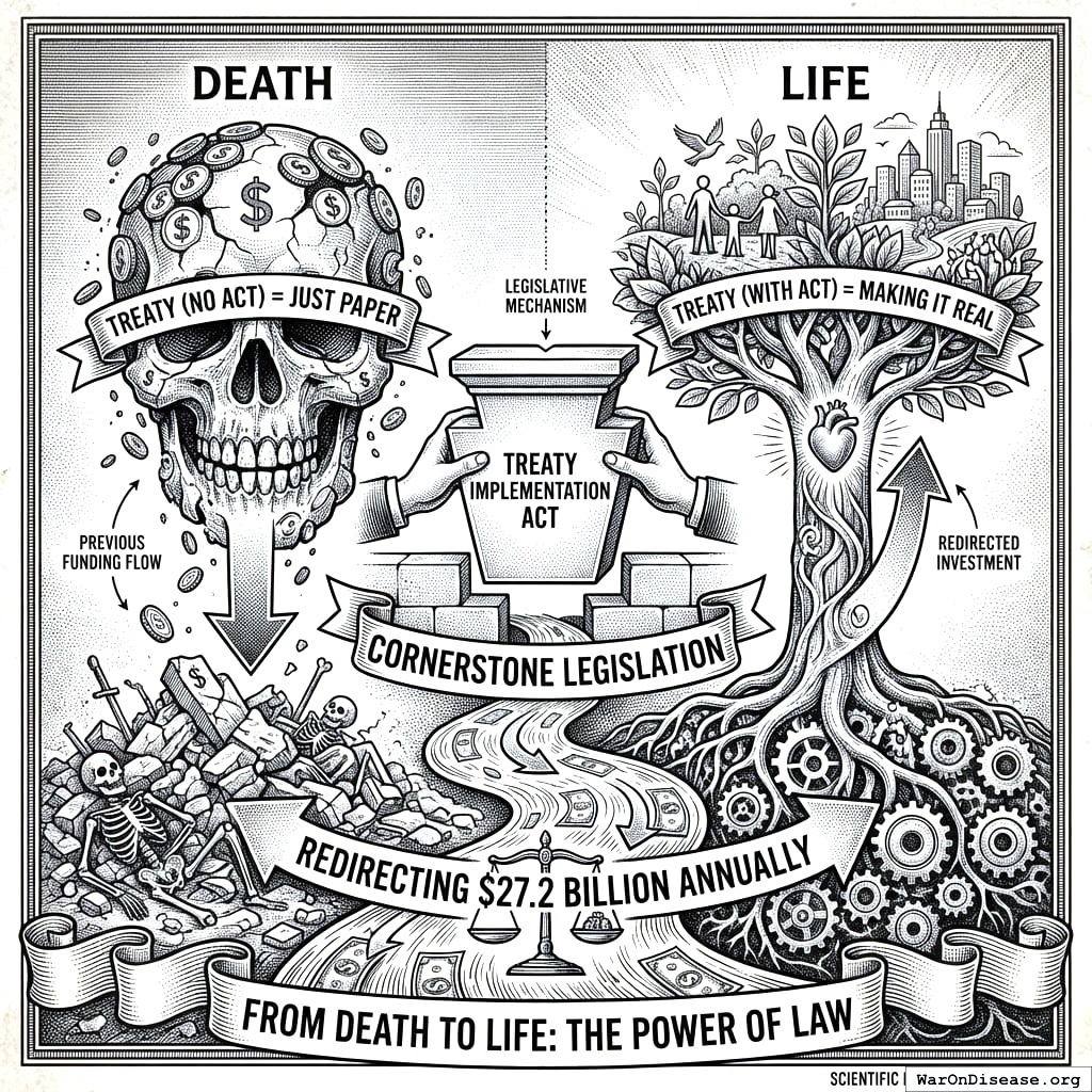 This is your cornerstone legislation. Without it, the treaty is just paper. With it, you redirect $27.2B annually from death to life.