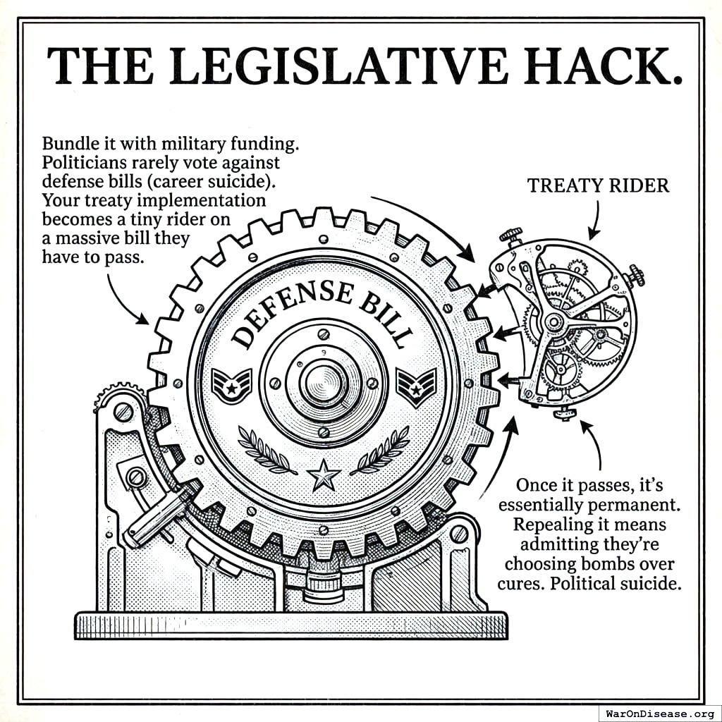 Bundle it with military funding. Politicians rarely vote against defense bills (career suicide). Your treaty implementation becomes a tiny rider on a massive bill they have to pass.
